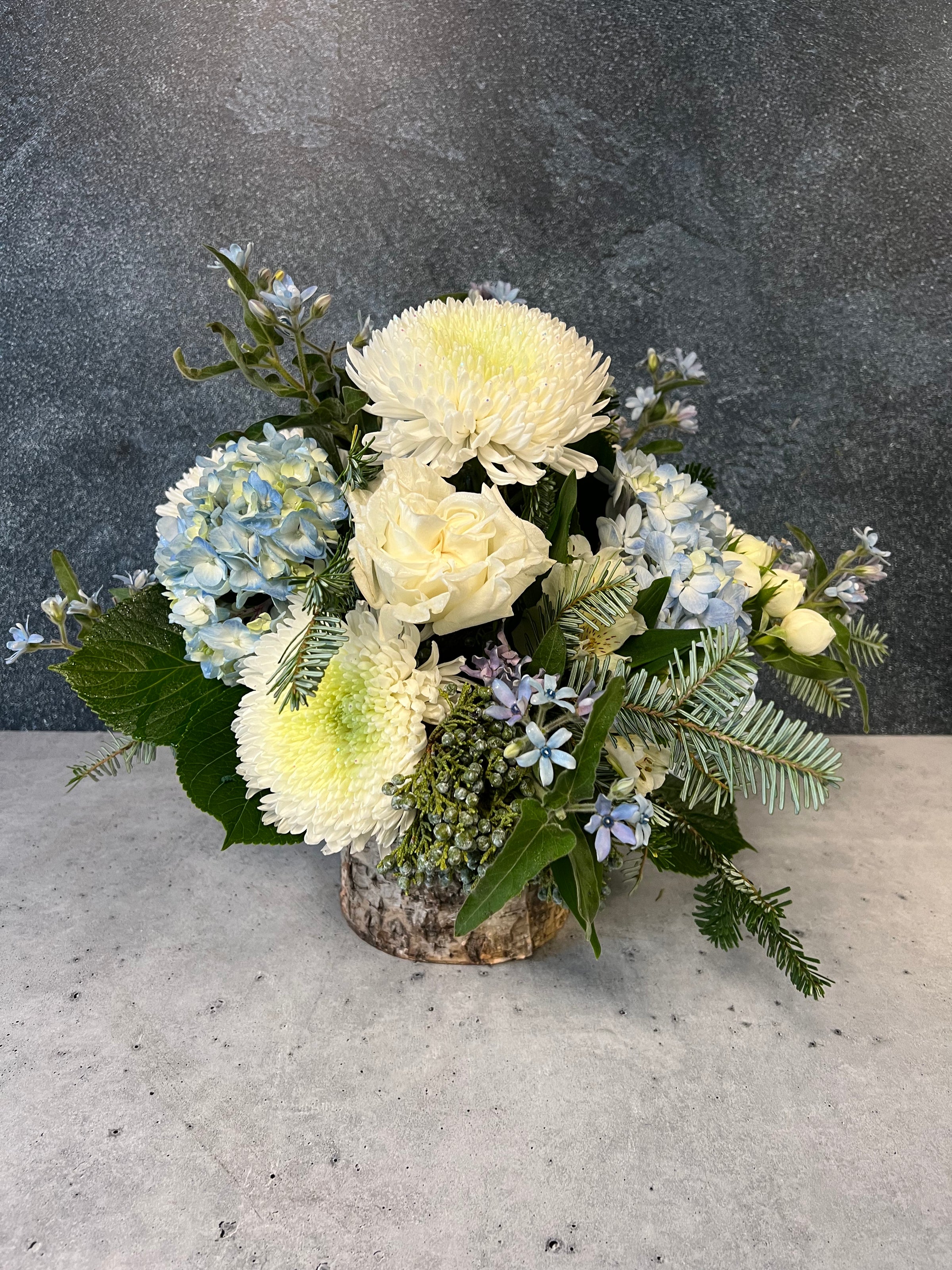 “Birch and Frost” captures the quiet elegance of winter’s frozen mornings, wrapped in icy blues, creamy accents, and the rustic charm of birch bark. This arrangement feels like a winter forest touched by frost, with every bloom and branch carefully placed to evoke serene beauty and holiday sophistication.